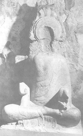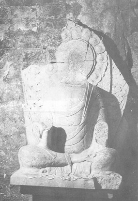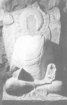 大留圣窟,开凿于东魏武定四年(546年)。北宋“灵裕法师传碑”记载为“道凭石堂”。石窟坐东向西,平面近方形,进深444厘米,宽378厘米,高350厘米。为三壁佛坛窟。窟内存佛像三尊,正壁为卢舍那佛(图8),头部残缺,身着双领下垂袈裟,内着僧祗支,胸前饰“卐”符号,结跏趺坐于方开束腰须弥座上,座下层正中刻“卢舍那佛”字样。身后莲瓣形火焰纹背光上部已残,圆形头光内饰莲瓣。右壁为阿弥陀佛(图9),头部残缺,右手手指残失,左手前伸施与愿印,结跏趺坐于方形束腰须弥座上,姿态、衣着与正壁卢舍那佛相似。背光大部分残缺,座下佛坛上开四个小龛,每龛内雕一神王,从形象看应是珠神王、象神王、鱼神王、山神王。左壁为弥勒佛(图10),头部残缺,姿态、衣着、背光与卢舍那佛相似。胸前饰“卐”符号右手从肘部残缺,左手施与愿印,结跏趺坐于方形束腰须弥座上。莲瓣形背光从头部以上残缺,残存部分外层刻有禅定坐佛。座下佛坛上雕四个神王龛与右壁相对称,分别为树神王、风神王、火神王另有一身神王因剥蚀不清而无法定名。