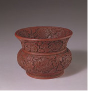 明代的奓斗除了瓷质外,还有其他质地,其造型也与前代不同。故宫博物院藏有一件明永乐剔红牡丹纹奓斗(图8)。器高11.5厘米,口径16.3厘米,足径11厘米,为清宫旧藏。该漆器奓斗撇口,短颈,鼓腹,圈足。通体髹朱漆,在菱形格锦地上雕花卉纹,器的腹部、颈的内外壁均雕俯仰相间的牡丹花6朵和含苞欲放的花蕾。足底髹赭色漆,左侧近足处针划“大明永乐年制”行书款。旁刻乾隆壬寅新正御题诗句,并钤“比得”“朗润”二方章。此器在锦地上压雕花卉纹的做法有别于当时以黄漆素地压雕花卉的主流做法,是为特例。