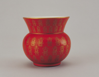 清同治红地金喜字纹奓斗(图12),故宫博物院藏。器高9厘米,口径8.7厘米,足径5.1厘米。敞口,圆腹,圈足。造型端庄小巧。内施白釉,外通体红釉色地,上以金彩满饰“喜”字纹。底白釉红彩书“同治年制”4字楷书款。此器为同治大婚用瓷。