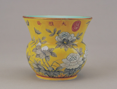 清光绪黄地墨彩花蝶纹奓斗(图13),故宫博物院藏。该器物高7.8厘米,口径9.6厘米,足径5.6厘米。撇口,粗颈,鼓腹,圈足,外底白釉内红彩书“永庆长春”4字楷书款。器里施青绿釉,外腹口沿红彩书“大雅斋”3字楷书款和“天地一家春”5字篆书款,器腹用墨彩绘花蝶纹。署有这两种款的瓷器是光绪时期景德镇御窑厂为慈禧太后烧造的专用器。