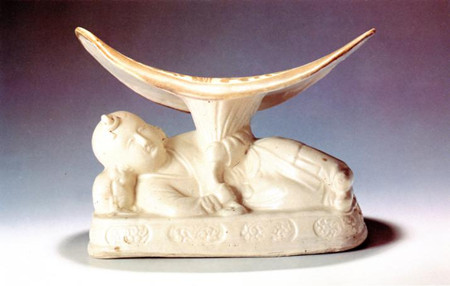 河南省上蔡县宋墓中出土的这件三彩童子荷叶枕,枕的底部是粉白色的长方形托板,托板上卧着一个童子,上面是一个荷叶,荷叶呈弧形的从两端向中间倾斜状,形成枕面。童子头顶蓄发一至数绺。颈饰项圈,手脚饰有钏、镯。右臂坦露,向后微曲。面目圆润,目视前方,头微微上仰,左手压于身下,右手执荷叶在身上作为枕面。在荷叶状枕面和童子臂部之间左右各有一个折叠的小荷叶巧妙的连接成一体。下身着绿色短裤,神态天真可爱。此枕的造型使人仿佛看到一群眉清目秀,满脸稚气的孩童们在晴空丽日下,乘着一叶小舟,手执荷叶在湖面上打闹戏耍。