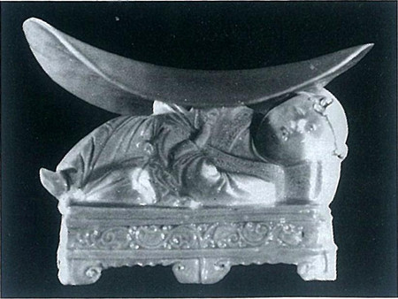 美国旧金山亚洲艺术博物馆藏的北宋定窑托芝孩儿瓷枕(图9)。此枕长21厘米,宽17.1厘米,高15.8厘米。枕座是一个高高的长方形床榻,榻外罩着丝织围裙。榻上竖一瑞草灵芝。娃娃测卧其后,曲腿翘足,双手合力掌托芝盖,作成为主人荐首的枕面。灵芝枕面圆润而舒张,似马鞍形,四周锯以荷叶边,上刻花纹,遮盖着下方的娃娃。娃娃凤眼淡眉,大头圆腮,留有北方孩儿的发式,前额梳一个发结,其余部分剃光。这种发式一般出现在小孩十岁之前。陶人似乎在用这种发式告诉我们,这男孩似乎并不愿意撑顶芝盖让人睡枕,他小嘴微撅,左腿用力,甚是可爱。