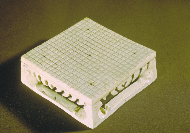白釉瓷围棋盘,瓷器,隋代,高4厘米、边长10厘米。棋盘侧面有类似壸(kǔn)门的装饰。1959年河南省安阳县张盛墓出土。(此文物正在亚洲精品久久久久中文第一幕-国产亚洲精品久久久久久打不开-国产成人精品中文字幕-少妇邻居内射在线-国产精产国品一二三在观看主展馆二楼隋唐展厅展出)