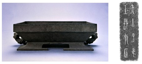 1966年,河南潢川县高稻场发现的两座春秋晚期中叶的木椁墓,因一号墓出土的铜簠铭为:“蔡公子义工之飤簠”(图八),被认定为蔡国墓葬。簠长30厘米、宽20厘米、高10厘米,呈长方形。直口,斜壁,短边两侧各有一个兽首状耳,平底,矩尺形足。器身以细密的蟠蛇纹装饰。内底有两行八字铭文。