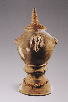 宁夏吴忠西郊唐墓编号为M045中出土的陶塔式罐(图四),通高76.6厘米。整器由相轮形纽盖、兽面罐和底座组成。相轮形纽盖分件制作黏接而成,盖盘呈覆碗状,敞口,圆唇,浅腹,内平底,中部黏接相轮形纽,上为宝珠。盖盘腹部和足,周围各有一周被卷压成花瓣状附加堆纹的泥条装饰。盖表面除相轮状纽和附加堆纹饰橘红色外,其余部分饰黑色。兽面罐为敛口,圆卷唇,低矮领,腹部圆鼓,平底腹部贴饰相对的象面和兽面。象面和兽面都为模制,象面平面略呈倒“山”字形,底面略凹。象长鼻,鼻尖向右侧卷,双耳宽长,嘴和眼微凸,额部饰二道凹槽,周围有和罐体黏接的抹痕。兽面呈圆形,底面内凹,正面高凸,兽咧嘴,獠牙较小。鼻短高凸,深眼凸睛,两角相连呈牛角状,额部圆突,双耳较大。兽面罐表面装饰采用黑色绘轮廓,灰色绘圆点纹,现因脱落变得较为模糊。底座上口部呈唾盂状,敞口,内方唇,外侧向上卷压成波浪状花唇,束颈鼓腹。底下部呈覆盆状,敞口,窄平沿,圆卷唇,深腹脱底,底径较大,腹部贴一周泥条向上卷压成花瓣状的附加堆纹。底座表面花唇和附加堆纹处饰橘红色,其余部分彩绘。