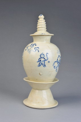 与陶质塔式罐相比,瓷质塔式罐,在全国出土文物中相对较为少见,除上文介绍的两件青花塔式罐外,见于报道的主要还有河北平山县三汲乡出土的一件白釉塔式罐[7]和1972年陕西铜川黄堡耀州窑遗址出土一件黑釉塔式罐[8],河北平山县三汲乡出土的白釉塔式罐仅有一个白釉罐,一个像莲花一样的白釉托盘和一个修长的喇叭形器座,三部分组成,疑这件塔式罐缺失一个盖。陕西铜川黄堡耀州窑遗址出土黑釉塔式罐,高51.5厘米,口径7.4厘米。盖为塔尖顶状,尖顶坐一小猴,猴曲腿直身,一手抚摸头顶,一手抚膝,作舒目远眺状。罐体为翻沿圆唇,短颈丰肩,上腹鼓圆,下腹斜收。方形平底,底座为不规则多边形,下腹部堆贴长叶形尖状花瓣,器底四周挖成壁龛形,内有捏塑的人物、佛像、花卉等,瓷质底坚致,釉色晶润,通体漆黑光亮。