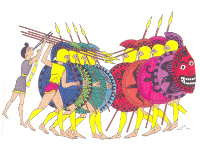 图五 重装步兵的密集方阵。左端为号手(据公元前7世纪瓶画加彩摹绘)