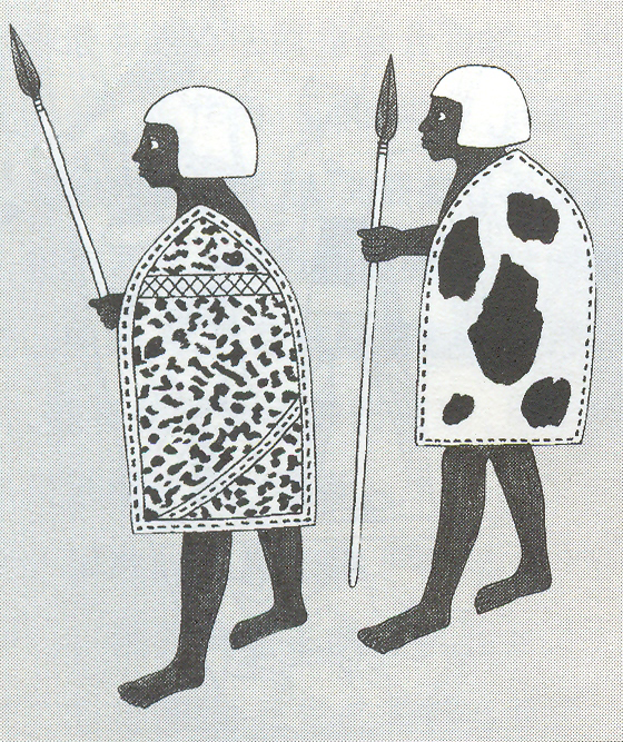 公元前2500年左右,苏美尔(Sumer)的军队。手持长矛的战士戴着头巾,身披战袍。战车兵手持战斧,用于打落敌人刺过来的长矛;左肩披兽皮,起着盾牌的作用。战车为四驴并驱的四轮战车。