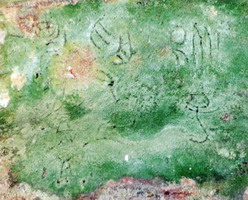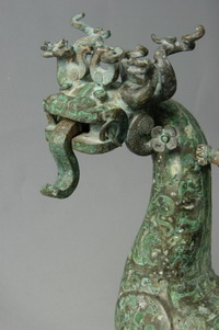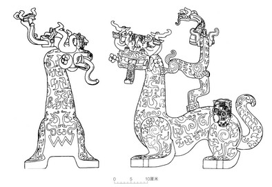 该青铜神兽(图二、图三)龙头、兽身。龙张口吐舌,獠牙交错,双目圆瞪,两颌各饰一朵柿蒂形花。龙首上以六条蜿蜒纠绕的小龙构成兽角。其脊背上有一方形孔,内插带方座的曲尺形支架,架上立一只奔兽,奔兽为龙首、双角、长颈、卷尾,口中衔一条曲体吐舌的小龙的尾部,两后爪后蹬于神兽颈之上部。神兽的后腿上部立一个镂空的方形插座。其最上部的龙角上有一穿孔,腹的下部有一半圆形钮。通体镶嵌绿松石,图案有龙、凤鸟、云纹、涡纹等,精美华贵。(图四)