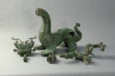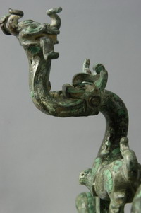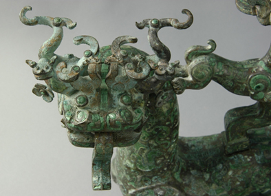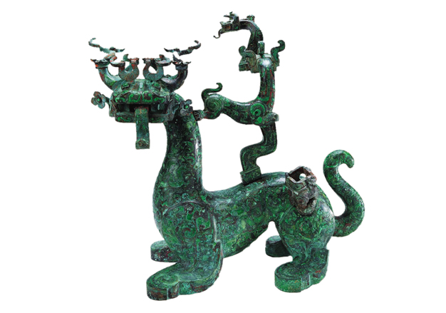 这件青铜神兽由多个部件组成,可进行拆装,且部件之间对接紧密。(图五)其铸造工艺水平之高,可谓既集先秦传统铸造工艺之大成,而又独具一格。神兽的铸造除一部分工艺受中原青铜铸造工艺的影响外,有的则是新的发明和创造,显示了楚文化在形成过程对中原文化的吸收、改造、升华,具有兼容并蓄、博大精深之丰采。器身采用商周以来我国中原青铜文化外范与内模合范后一次浇铸成完整器形的方法——浑铸法(范铸法)的优秀传统。器表采用的嵌绿松石工艺,亦是对中原文化的继承与发扬。青铜神兽用绿松石镶嵌龙、凤等图案后所形成的绚丽多彩的装饰效果,令人赏心悦目。而神兽头上蟠绕的小龙等,是春秋中后期楚国先进的青铜铸造工艺——失蜡法的创新与应用,使神兽的造型风格华丽灵动,有着与同期中原器物完全不同的美感,呈现出无法比拟、独放异彩的特点,成为一个历史时代青铜器的杰出代表。