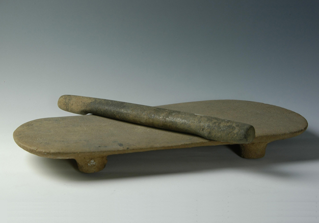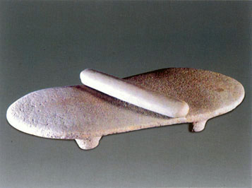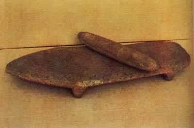 内蒙古自治区赤峰市红山文化遗址出土的石磨盘和石磨棒,磨盘为长方形,平底,面呈凹弧状。磨棒为圆柱体。用砂石打制后磨光而成。