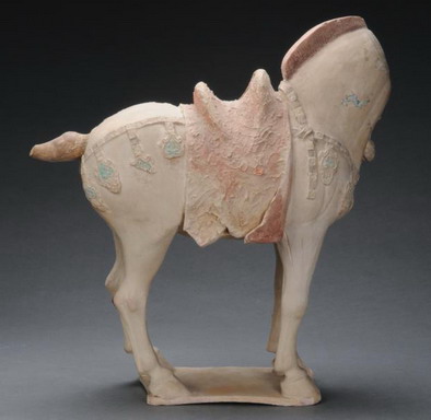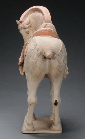 马头戴有络头,嘴两边有角形镳,口内有衔,马脸颊两侧饰有杏叶。眼部用墨笔勾勒出眼眶。头部前马鬃分缨,颈背上的马鬃被整齐修剪。马背上置鞍鞯、障泥。鞍上盖有鞍袝,前端袝角向后作迎风翻折之势。攀胸和鞦带上均饰有杏叶。缚尾上翘。鞍鞯、鬃毛饰朱红彩,杏叶饰绿彩。泥质白陶,模制而成,立于长方形板座上。马勾首作瘙痒状,前腿柱立,后腿若弓,耳朵一个向前一个向后,神态形象逼真,刻画出安详、舒逸的姿态。马的体态雄健,特别是臀部和腿部塑造的肌肉和骨骼比例协调,显得浑圆而不臃肿,矫健而不失俊雅。马的造型完美,气质高贵,形神皆备,是唐马陶塑中不可多得的精品,显示了唐代陶塑匠师的高超技艺,是研究唐代陶塑艺术及葬俗的形象资料。(图一、二、三、四)