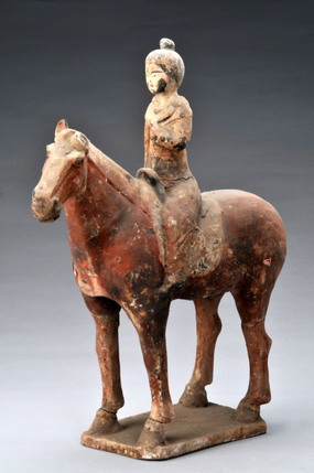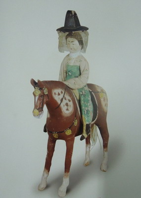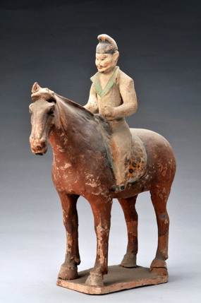 图七 男子骑马俑(通高38厘米,马身长31.5厘米,1998年偃师市唐恭陵出土)