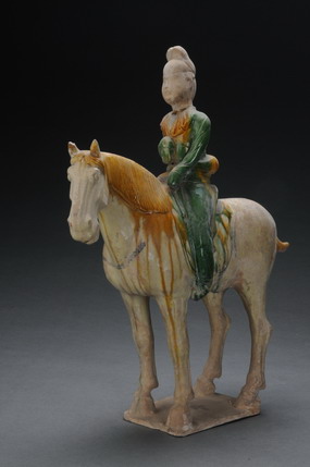 图九 三彩骑马男俑(高43厘米,长36.5厘米,河南洛阳市出土)