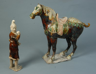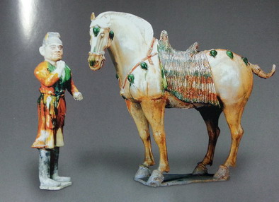 图十二 三彩马和三彩牵马俑(马高68.1厘米,长80.2厘米,牵马俑高61.5厘米,长22.5厘米,1981年洛阳市安菩夫妇墓出土)