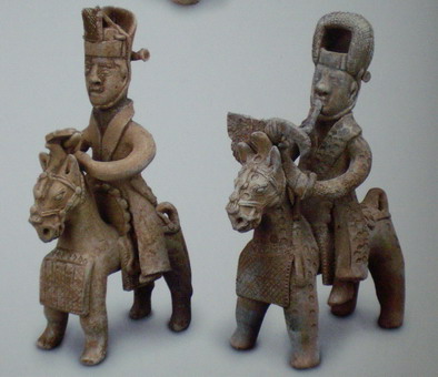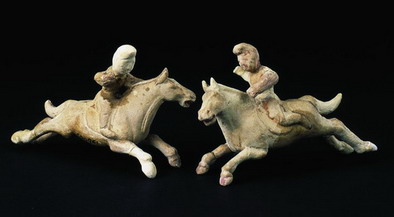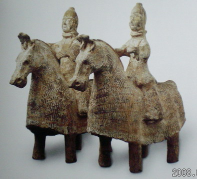 图二十七 骑马武士陶俑(北魏,分别高38.5厘米、37.4厘米,马长34.5厘米,1953年陕西西安草场坡出土)