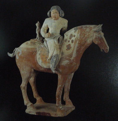 图二十二 骑马带猞猁狩猎女俑(高33.5厘米,宽12.3厘米,1992年陕西西安市东郊豁口唐金乡县主墓出土)