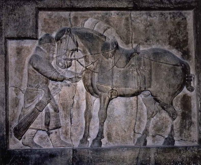 唐代帝王对于马的喜爱也是不容忽视的,以唐太宗李世民为例,他非常喜爱良马。在大唐建立的过程中,有六匹战马跟随他南北征战,立下了汗马功劳。李世民对这几匹马怀有深厚的感情,一直还念念不忘,并令当朝著名画家阎立德和阎立本摹其形象,雕刻在他陵前,以期相伴永远。(图六) 唐政府在全国设立一套完备马政制度的同时,其帝王在宫廷内也设立专门掌管御用马匹的制度。设立尚乘局掌管天子的御驾,并设立飞黄、吉良、龙媒、騊駼、駃騠、天苑左右六闲和祥驎、凤苑二厩来饲养马,此后又增加飞龙厩[4]。别看这只是替皇帝饲养马匹的机构,其权利后来被宦官掌控,成为以后唐代宫廷政变的重要参与者。