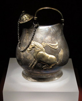 图二十一  鎏金舞马衔杯纹银壶(通高14.4厘米,口径2.2厘米,底径8.9-9.2厘米,重547克。1970年县南郊何家村出土)