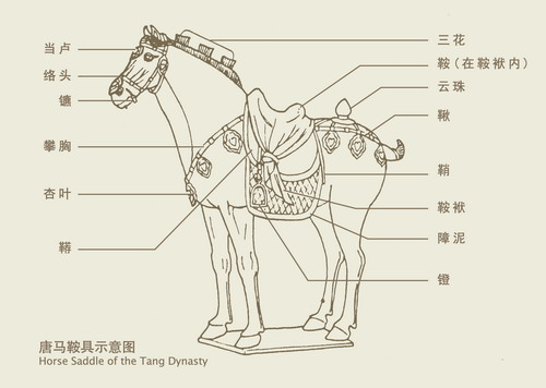 3.鞍。我国远古也不用鞍。春秋时可能已有雏形的鞍。秦始皇兵马俑坑和咸阳杨家湾西汉墓随葬坑中所见的陶战马,于鞯上都置鞍,不过鞍桥较低。西汉时所见鞍桥已经高了。唐代作了调整,后鞍桥向下倾斜,更便于乘者上下,对人体也更适合,可以称为“后桥倾斜鞍”。