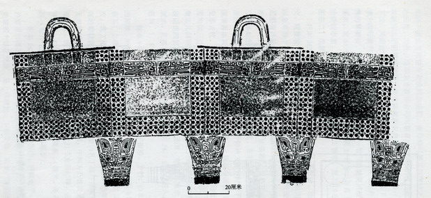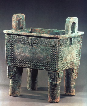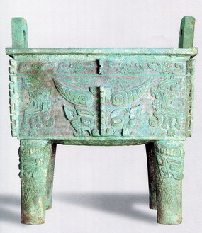 据传1939年河南省安阳武官北地出土的司母戊方鼎(学术界认为应改名为“后母戊鼎”),商代晚期,通高133厘米,口长116厘米,宽79厘米,器重875千克,是目前发现的商代铜器中最重的。该器器体呈长方形,深腹平底,口上有一对立耳,其一为后配。四中空柱足,四角有扉棱。鼎耳外侧有双虎食人首纹,四壁周边饰兽面纹,中央素地无纹。四足上部饰浮雕兽面纹。腹内壁有铭文三字。