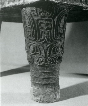 1974年,河南省郑州张寨南街出土的兽面纹方鼎(图四),商代早期,高100厘米,口沿长62.5厘米、宽60.8厘米。该鼎直口,折沿,方唇,口部近似正方形。斗形方腹,平底,四空柱足。腹饰兽面纹和乳钉纹。兽面纹共八组。乳钉纹饰于每壁两侧和下部。足上部饰兽面纹,下部饰弦纹。该鼎是商代早期铜器最大的一件。