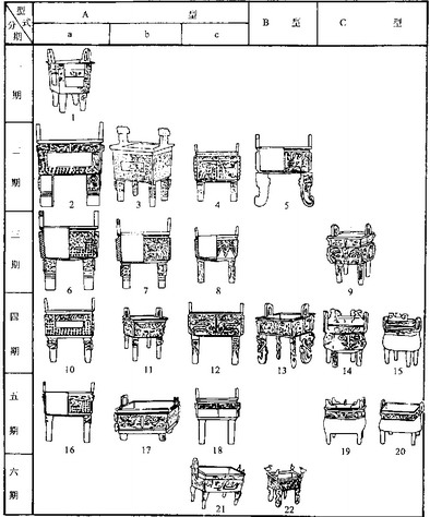 以饕餮乳钉纹铜方鼎为代表的早商方鼎可以说开方鼎之先河。早商之后,各种形式的方鼎逐渐发展起来。杨宝成先生曾统计历年所出的一百余件铜方鼎,将整个商周时期的方鼎分为方体柱足、方体扁足和椭方体柱足三类,简称为A、B、C三型,并分出六期[4]。一期年代属二里岗上层,也就是早商时期;二期年代为殷墟一期或更早,即晚商早期;三期年代为殷墟后期,即晚商后期;四期年代为西周早期,下限不晚于康王之时;五期年代为西周中期;六期年代为西周晚期。