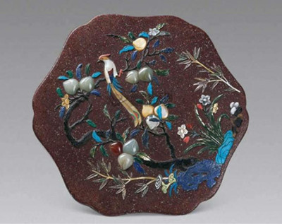 (5)漆镶嵌。乾隆时期的漆镶嵌,主要是嵌螺钿和百宝嵌。虽然镶嵌的图案、纹饰及所用的材料不同,但镶嵌技法类似,都是以朱漆、黑漆做地,再嵌以各种图案纹饰。嵌螺钿工艺大致可分为两类:一类用的是厚螺钿;另一类用薄螺钿。用这两种螺钿镶嵌的漆器在清代都较普遍。从已知的实物来看,嵌螺钿漆器除了单独嵌螺钿外,也有与其他漆器工艺相结合的工艺,如描金嵌螺钿、彩漆嵌螺钿等。而百宝嵌,则是在螺钿镶嵌工艺的基础上,利用珊瑚、玛瑙、玉石、象牙、犀角等珍贵材料的质地、颜色,雕成各种山水人物、树木楼台、花卉鸟兽等图案,镶嵌在彩漆板上。(图11)
