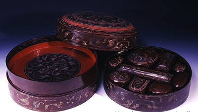 至春秋战国时期,人们使用了髹漆工艺,大量的生产了许多器型多样的生活器具,装饰纹样丰富多变,祥禽瑞兽充满动势,富有神秘色彩,中国漆器发展进入了第一个辉煌时期。已知的出土的战国漆器以受楚及楚文化影响最为集中的湖北、湖南地区为代表。秦汉时期,国家的大一统、经济的发展、物质的丰富,令手工业发展迅速。特别是在西汉时期,漆器工艺在春秋战国发展的基础上,达到审美功能与实用相统一的发展高峰。(图3)将西汉与战国时期的漆器发展成就相提并论,不仅仅因为它们当年的产量和今天的流传同样巨大,在当时社会生活和艺术发展里的地位同样重要,更为后来漆器的发展打下了坚实的基础。这已被数以万计的考古发现证实。在湖南、湖北、江苏、安徽、四川、山东等地发现的西汉时期等级较高的墓葬里,可以一次出土数十件乃至上百件漆器。而在较偏远的贵州、广西,甚至在朝鲜、蒙古也有发现。当时出现的金银箔贴花发展成绚丽夺目的金银平脱,成了唐代最具代表的装饰;锥画则演变为精美的戗金银,成了宋元时期漆器的重要代表;而进入汉代才兴盛起来的夹纻胎工艺甚至延续到了清代,成为著名的脱胎工艺。