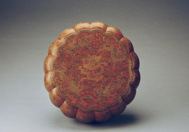 填漆描金云龙纹菊瓣式盒,漆盒整体为菊瓣式,鼓腹,圈足。分为上下两部分,上部为盖,下部为器身,由子母口分出器身和器盖。内里整体髹黑色漆,外部髤枣红色漆地。采用填漆戗金技法,雕刻不留空地,浑然一体,其纹样细如毫发,流畅自然。漆盒盖面装饰云龙戏珠纹,纹饰正中装饰一条张口睁目,须发张然的五爪团龙,四周是四条云龙,在云海中追逐嬉戏。器盖等分为十六瓣,每瓣上均饰云龙戏珠纹。上下口沿饰云蝠纹,器身也等分为十六瓣,均以海水与流云纹装饰,圈足绘有回形纹饰。