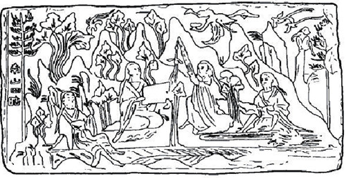 图4 邓县学庄村南朝画像砖墓南山四皓线描图