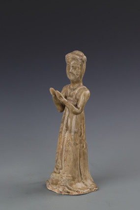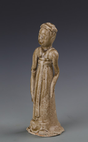另外两件舞俑(图8、图9),高21厘米,底径7厘米,形制与大小基本相同。舞俑两眼微微睁开,发髻高盘上梳于头顶,面部丰润,嘴角微微上扬,神情自然安详。两个舞俑一个右手臂屈伸至腹部,左臂垂下,另一个两手臂向后放于身体两侧。两个舞俑身着襦裙,袖口垂下遮住双手,胸前的飘带垂于身前,长裙及地,脚着方头鞋,似翩翩起舞。