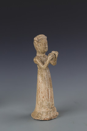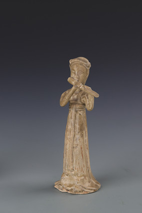吹笙伎乐俑(图4),高21厘米,底径7厘米,两眼微微睁开,两只手臂向上,两手持一笙,脸颊微微鼓起作吹奏状。