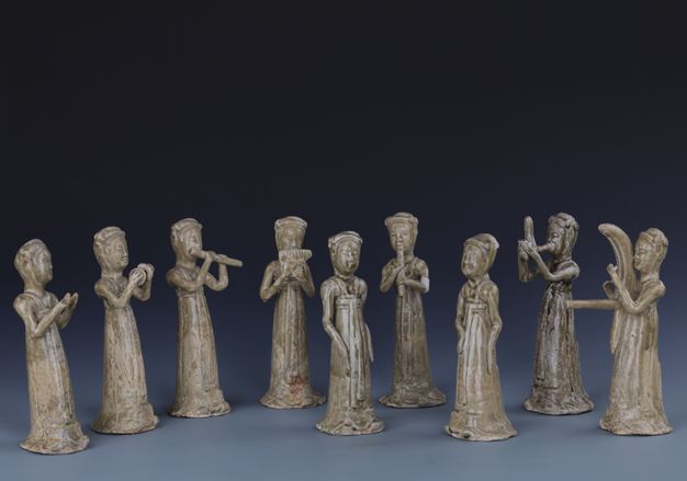 青釉伎乐俑,瓷器,隋代,共9件,高21-21.5厘米,底径7-7.5厘米。2008年河南省安阳市龙安区置度村M8隋墓出土。由安阳市文物考古研究所发掘,现在安阳博物馆内展出。