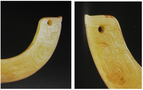 西周玉璜多承袭商代玉璜的特征,其形制仍有素面璜、龙纹璜和其他一些动物形璜。其中龙纹璜十分流行,但不同于商代的一璜一龙,而是一璜上饰双龙纹,龙首分置璜的两端,龙身在中部或叠置、或缠绕、或并列对称。到了西周中晚期,玉璜的形制、构图和佩戴方式发生了显著的变化,使其在传承商代玉璜的基础上表现出了鲜明的时代特征。此时,大型组玉佩盛行,玉璜在组玉佩中起到了支撑构架,上下、左右连缀,保持平衡的作用,所以此时玉璜不再刻意强调写实,图案与璜体形构的一致性,转而注重形构、纹饰的对称平衡,璜上一穿和无穿者也少见,至少是两穿以上。西周中晚期,玉璜上的雕琢线条一改商代和西周早期的刚直、方折,而代以大量的弧线,使纹饰更加流畅、圆润。还出现了“大斜刀”的雕琢工艺。
