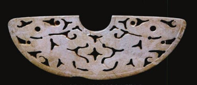 良渚文化半璧形镂空璜(图6)[11],浙江余杭瑶山M11号墓出土,白玉形制略呈扁宽半璧状,两面均以镂空勾勒出复杂兽面纹,兽面纹外阴刻边阑,孔径两侧各对钻两个圆穿系孔。