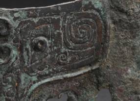 从纹饰上看,器身上的兽面纹遵循了商周时期青铜器纹饰对称的基本原则。器身上的这组兽面纹,双角粗大弯曲,除有一个小缺口外,几乎弯成一个圆角长方形,与圆睁的双目形成浮雕式的突起(图二)。兽面的眼角、眉、鼻、额部夔纹用阴线勾勒出线条,精致细腻。兽面纹下部的半圆形吻部,内有凹形纹的牙齿,纹饰凸起,形成镂空的浮雕,制作精美(图三)。兽首似作吞咽状朝向器物刃部被刺者,显示出一种狞厉恫吓的威慑气势。