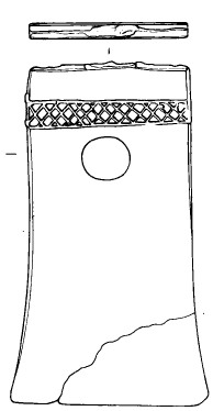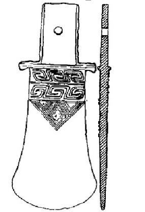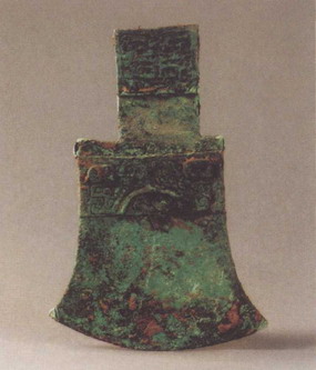 随着人类文明和生产力的进步,钺的材质逐渐由石料转变为金属。河南偃师县二里头遗址中出土的铜钺(图五),为长方斧形,刃角外侈,整器残长13.5厘米,宽6.1厘米,刃宽7.6厘米,厚0.5厘米。钺身近肩部饰带状网纹一周,花纹凸起。其下有一圆孔。这是我国目前出土年代最早的铜钺。