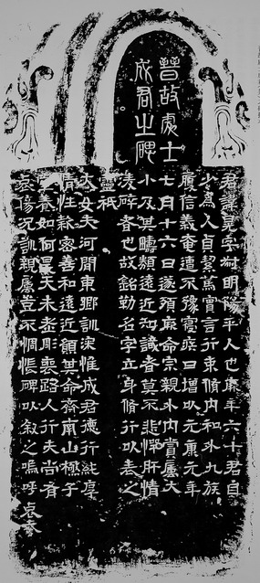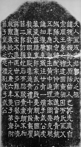 这种仿照碑式志墓的遗风一直延续到南北朝初期。在北魏孝文帝迁洛前鲜卑人墓志为小碑形式,迁洛后邙山墓志则改为志文志盖相合体,但仍有碑形墓志出现,如北魏太和23年(499年)韩显宗(圭首长方形)和北魏正始四年(507年)奚智墓志(圆首长方形)等皆为小型碑状墓志。在迁洛后的古平城地区也有晋制遗风。如1984年在大同市小南庄(古平城东南)发掘出土了北魏永平元年(508年)元淑墓志,高74厘米,宽42厘米,形制为圆首碑形,下有碑座,是延用了晋制的实物,[11]但此碑书刻则采用了迁洛后志中通用的魏碑体,可谓“旧瓶新酒”。