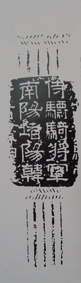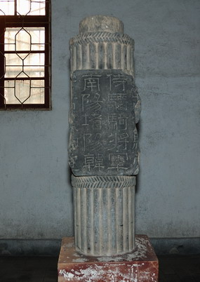 韩寿,《晋书》无传,其事附《晋书•贾充传》,官至散骑常侍、河南尹,元康初卒。解放前洛阳出土有西晋元康(291—299年)《韩寿神道柱》,柱体残高113,直径33厘米,现藏洛阳关林石刻艺术馆。石柱为石质圆柱形,上端有一圆榫,顶、座已佚,仅存柱身中间一段。柱身刻垂直的瓜棱纹,一侧有表铭,其上下各雕一绳辫形围带。表铭上刻隶书4行,行5 字。中间两行题“侍骠骑将军,南阳堵阳韩”,两旁两行泐损,据残存笔划和史载韩寿生前官爵及卒后追赠,铭文全文为“晋故散骑常侍、骠骑将军、南阳堵阳韩府君墓神道”4行20字。(图十二、十三)。国内现存神道柱以南朝诸帝陵遗存最多,此石柱残存部分与南朝石柱相同,可证明南朝石柱直接承袭西晋遗风。[14]书体承汉魏风格,笔划俊逸,波磔浑敛,并有缪篆笔意,为西晋隶书中的杰作。