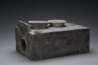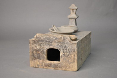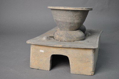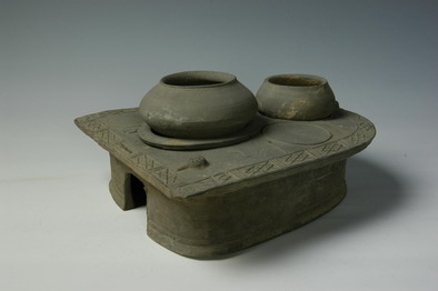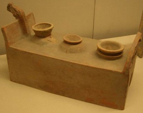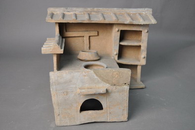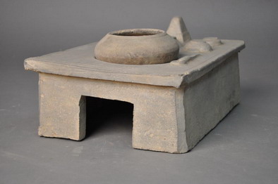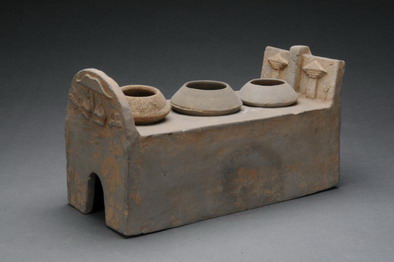 总的看来,两汉时期是我国有封闭燃烧室和固定烟道的炊具——灶的出现和定型阶段。河南各地出土的汉代陶灶,特别是以三门峡、洛阳、南阳、新乡四大区域为中心所出土的汉代陶灶,虽然都有鲜明的地方特点,但也都有一个从简单到复杂的发展过程。西汉中前期的陶灶,形制相对较为简单,多有1个火眼,在墓葬中出土数量不多。到了西汉晚期,灶面火眼开始增加到2~3个,灶面也开始出现了模印食品和厨房用具,并在灶面边缘和侧面出现刻划图案,使陶灶更具有了装饰艺术性,这表明陶灶在随葬陶器中的地位日趋重要,几乎成了墓葬必需的随葬品之一。约在西汉晚期至东汉早期,随着前有遮烟檐、后有带罩的塔式或亭式烟囱、灶面有3~4个火眼的陶灶出现,说明灶的效用得到进一步提高,这一时期作为随葬品的陶灶模型也达到制作的鼎盛期。东汉中期,尤其东汉晚期以后,随着陶质随葬品中家畜、家禽模型及奴仆俑的流行,陶灶在随葬品的地位开始下降,不仅数量减少,而且工艺也较粗糙。