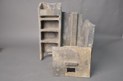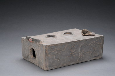 在河南汉代墓葬出土的陶灶中,以洛阳烧沟汉墓群为最集中,在清理的225座墓葬中,共出土陶灶155件。除一期墓葬(时间在西汉武帝~宣帝之间)的28座墓中无陶灶外,从二期开始陶灶逐渐增多,其中有6座墓葬各出土2件,其余都是每墓出土1件。灶的主体形状除属西汉中期的M183出土的1件较为特殊呈正方形外,其余都作长方形,无底。陶灶多由灶身、灶面、灶门、火眼、釜、甑等构成。灶门不论时间早晚仅有方形和弧顶形两种形制,而且这两种形制一直并存。灶身各部分别模制,然后粘合而成。少数在粘合处留有按压的痕迹,有的将粘合处的转角以及灶面前端两侧的棱角削去。灶面装饰物大都是覆扣的杯、盘、碗、瓢、勺等厨房用具和鱼、肉等食物。除瓢、勺有部分是单独配备的用具外,其他主要为模印而粘附于灶面上,也有个别是与灶面同模一次印出的。洛阳烧沟汉墓群出土的陶灶形制复杂,变化很大。根据出土墓葬时间早晚、火眼的多少以及灶面装饰,洛阳烧沟汉墓群出土的陶灶可分为四种类型。第一种类型的陶灶出土于西汉中偏晚期的墓葬中,数量较少,仅有4件。陶灶为一个火眼,灶面无装饰。灶后烟囱各不相同,有作粗大的方形,有作较小的圆柱形,有作扁直钮状,也有的作梯形。第二种类型陶灶出土于西汉晚期和王莽新汉之前的墓葬中,数量最多,除有一个大火眼的陶灶外,一大一小两个火眼的陶灶开始出现。火眼上的甑、釜里开始放置瓢、勺。灶面装饰也开始出现鱼、鳖、肉、猪头、羊头等食物和刀、耳杯、碗、盘、筷、扫把等厨房用具的模印纹样。灶面后缘的烟囱除一件为圆锥形外,其余全为模印的方锥形。灶面边沿多数刻划有几何纹饰。第三种类型的陶灶出土于王莽新汉时期和东汉早期的墓葬中,灶体变大,火眼开始增加到3~4个。灶面后端中部作1圆孔或方孔,上放葫芦形或亭形的烟囱。这类陶灶大多仅在灶面的两边划1条或者2条大鱼作装饰,灶面边缘多数划斜方格纹,高出灶面的遮烟檐和前壁灶门上端则多饰三角纹。第四种类型的陶灶出土于东汉早中期的墓葬中,灶面火眼数量有1~4个不等。灶面模印物多为鳖、肉、猪头、羊头等食物和刀、耳杯、碗、盘、筷、扫把等厨房用具。灶面边缘印有复杂的几何形纹饰。这类陶灶都没烟囱,但在灶面后端的模印花纹中间都作有一个方形的纹饰,以作烟囱眼的象征,也有个别穿1小圆孔。灰陶灶(图5)洛阳烧沟汉墓群出土。灰陶灶(图6),洛阳烧沟汉墓群出土。灰陶灶(图7),洛阳专区粮库工地汉墓出土。