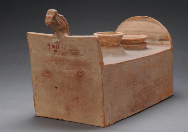 红釉龙头烟囱陶灶为长方形,红陶胎,模制。上面设三个火眼,上附三个釜,其中第一、二釜上置有甑(图1)。灶前壁高出灶面有拱式遮烟檐,前下方中间有拱形通地火门,火门上方有一灶神位于一模印的庑殿建筑中央。灶后壁高出灶面有呈矩形的挡风墙,中间伏有一昂首张口的龙首作烟囱(图2)。这件陶灶制作精细,设计别致。灶前设灶神主管饮食制作,灶后设以龙(水神)首来象征烟囱,以防御火灾,祈福保平安。灶是汉代常见随葬明器之一。这件红釉龙首烟囱陶灶,真实再现了汉代民用灶的建筑形制,是研究汉代葬俗及炊食文化的重要实物资料。