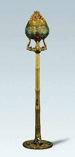 1981年陕西省兴平市茂陵东侧出土的鎏金银竹节铜熏炉[6](图三),通高58厘米,底径13.3厘米,口径9厘米,盖高6厘米。炉体为博山炉形式,炉体、长柄、底座均为分铸,而后铆合在一起,通体鎏金银,华美异常。熏炉底座上透雕着两条蟠龙,昂首张口咬住熏炉的长柄;长柄巧妙的仿竹节形制,共分五节,节上刻着竹叶,柄的上端有三条蟠龙将熏炉托起。熏炉炉体为博山形制,炉体下部雕饰蟠龙纹,底色鎏银,龙身鎏金,炉体上部浮雕有四条金龙,龙首回顾,龙身从波涛中腾出,线条流畅,造型奇妙。该件铜熏炉炉盖口外侧有一周铭文,共计35字:“内者未央尚卧,金黄涂竹节熏炉一具,并重十斤十二两,四年内宫造,五年十月输,第初三。”底座圈足外侧亦有一周铭文,计33字:“内者未央尚卧,黄金涂竹节熏炉一具,并重十一斤,四年寺工造,五年十月输,第初四。”这些铭文显示,该件熏炉为西汉皇家未央宫所用,为了解西汉时期宫廷生活用器的铸造及其制度提供了宝贵的实物与文字资料。