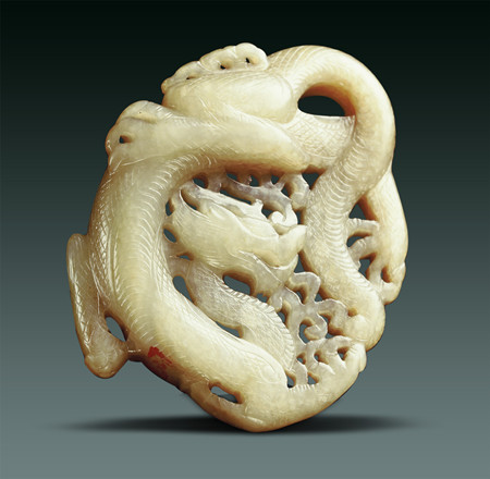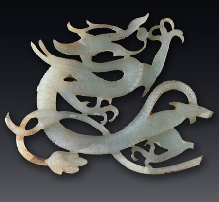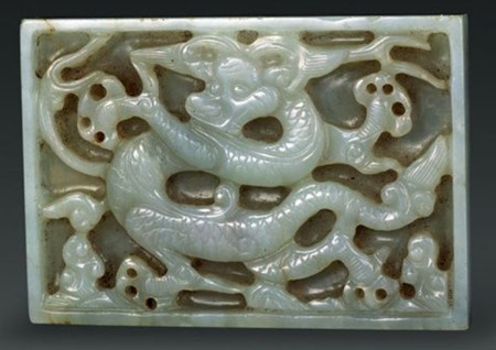 中国国家博物馆藏宋代玉龙。高6.2厘米,长7.5厘米,厚0.3厘米。玉质为白玉,镂空雕刻。玉龙张口露齿,嘴形较长,上唇较厚,内刻斜线纹。眼呈菱格形,单叉形角。发在脑后弯曲,成漂浮状。身体盘旋起伏,身上布满鳞纹,背有脊齿。四肢弯曲,胫上刻阴线纹,有三爪(图10)。