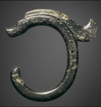 1998年,在安徽凌家滩遗址M16中发掘出土一件龙形玉器[13]。该器长径4.4、短径3.9米、厚0.2厘米。玉龙颜色呈灰白色,泛青。整体呈扁椭圆形,首尾相连。吻部突出,头顶雕刻两角,阴线刻出嘴、鼻,阴刻圆点为眼,脸部阴刻线条表现折皱和龙须。龙身脊背阴刻规整的圆弧线,连着弧线阴刻17条斜线并两侧面对称,似龙身鳞片。背部近尾处有一对钻圆孔。玉龙两面雕刻基本相同(图5)。其年代距今5500-5300年。