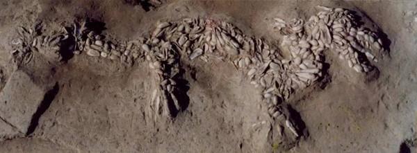 1987年,在河南濮阳西水坡仰韶文化遗址中出土了三条蚌壳摆塑的龙形[20]。其中M45号大墓龙形最长。该龙位于墓主东侧,用白蚌壳摆塑而成。长1.78米、高0.67米。头北尾南,背西爪东,龙头似兽,昂首膛目,嘴半张,口吐长舌,颈上有一小撮小短鬣,长颈弯曲,身细略呈弓形,前后各一腿,爪五叉,长尾微曲,尾端作掌状分岔(图14)。其年代距今6400年。