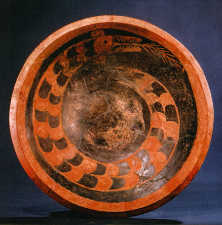 20世纪80年代,中国社科院考古研究所在山西襄汾陶寺墓地几座随葬品十分丰富的大墓中,清理出几件彩绘龙纹陶盘[23]。以M3072出土的彩绘龙盘为例,龙纹大致呈蛇形,在盘的内壁和盘心作蟠曲纹,头在外圈,身向内卷,尾在盘底中心,体饰弧状片彩,方头,豆状圆目,张口吐长信。颈部上下对称绘出鳍或鬣状物(图17)。其年代在距今4400年前后至距今4300年前后,其下限年代的可信范围还可定在距今4100年左右。这是我国中原地区首次发现的距今4000年前的龙形象。山西襄汾陶寺的彩绘龙盘出自该遗址规模最大的墓葬,并与笼鼓、特磐等重要礼器同出,可能具有非凡地位。