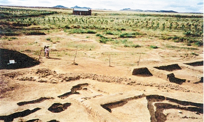 1994年,在辽宁省阜新县查海遗址发掘出一条用石块堆塑的巨龙[18]。该巨龙位于遗址聚落中心的小型广场内。龙头朝西南,尾东北,全长19.7米,身宽近2米,用较均等的红褐色石块堆塑而成。龙头、躯干石块堆塑厚密,尾部较松散。龙昂首张口,弯身弓背,蜿蜒伏地(图12)。在龙腹南侧下方发现墓葬和祭坑3个,坑内发现较多猪骨。查海遗址的年代曾作过两次测定,第一次碳十四测定经树轮校正为距今7600年前。第二次碳十四测定为7360±150年,树轮校正距今超过8000年。