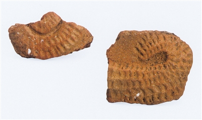 1986年,在查海遗址出土两块龙纹陶片[22]。一为蜷曲的尾部,一为盘旋的龙体。皆采用浮雕手法制成。这两块龙纹陶片虽然不大,只有十几平方厘米,但是龙的形象却表现得相当清晰(图16)。